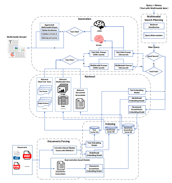 - 文档解析与索引 → 多模态搜索规划:解析后的结构化数据为搜索规划提供 "可检索模态类型" 与 "数据分布信息",帮助规划模块选择最优检索策略。