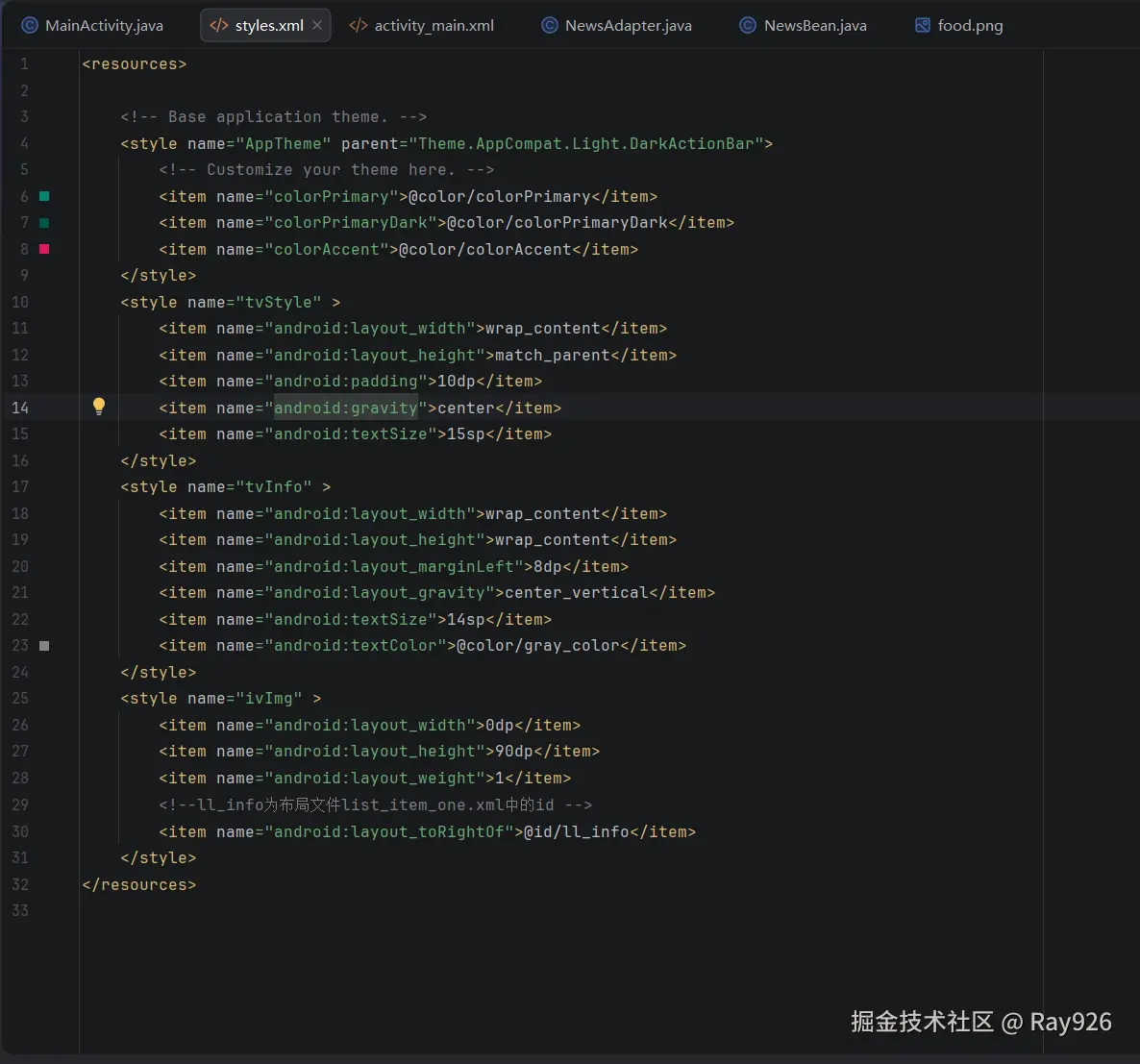 项目框架主要为三个部分 MainActivity(运行程序)、res/values/styles.xml(样式)、layout(布局)