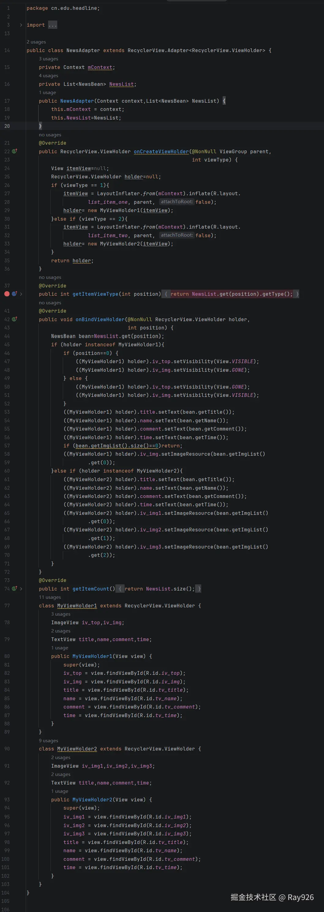 这行代码的作用是为 RecyclerView 设置布局管理器 ,决定列表项的排列方式。这里使用的是 LinearLayoutManager,让新闻列表竖着一条一条排列(类似抖音、头条的列表样式)。