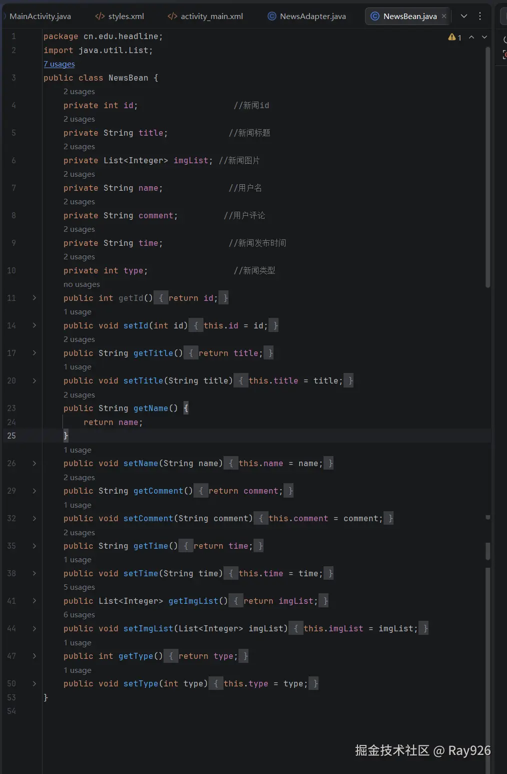 - 数据封装:使用 NewsBean 类将零散的数据封装成对象,便于管理和传递