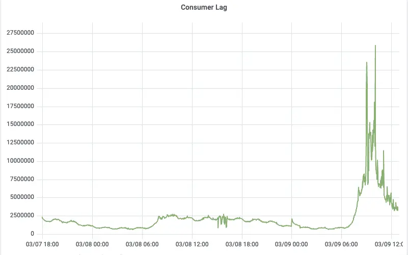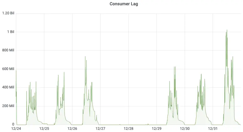 对比最为直观的是 Consumer Lag 曲线:切换前,业务高峰期积压峰值超过 10 亿条消息;切换后,同样的业务流量下积压量下降了 40 倍,消费者能够快速追上生产进度。