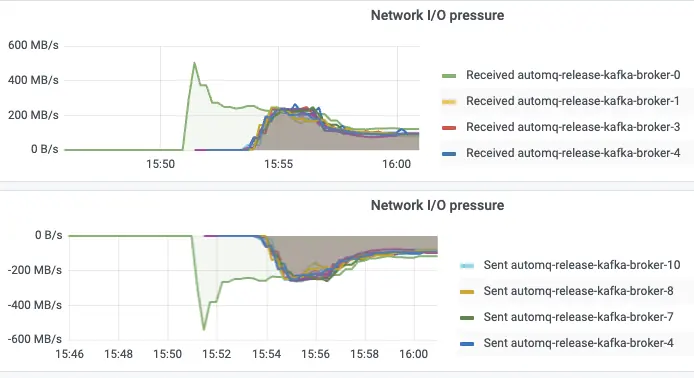 360 团队设计了一个极端场景来验证这一能力:集群初始只有 1 个 Broker,创建 1000 分区的 Topic,直接以 1 GiB/s 的流量发送。从监控告警触发到批量扩容再到流量自动均衡,全程 4 分钟完成,无需人工干预,实际验证效果如下图所示。