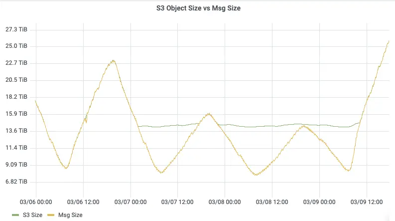 从吞吐监控可以看到,切换后的日志检索集群在业务高峰期峰值吞吐达到 1.4 GB/s,30 个 4C/16GB 的 Pod 即可稳定承载,写入曲线平滑无毛刺。