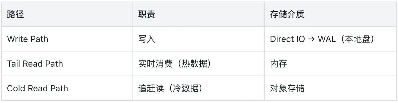写入使用 Direct IO 绕过 Page Cache,从根本上避免了冷读对写入路径的干扰。冷读走对象存储的高吞吐通道,充分利用对象存储的带宽能力,不与写入和实时消费争抢资源。三条路径在架构层面彻底隔离,意味着无论下游消费者积压多少数据,追赶读都不会影响生产者的写入性能。
