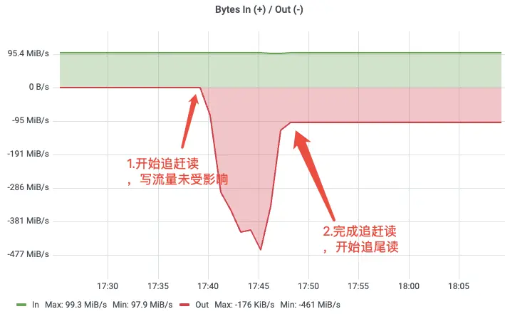 团队以 100 MiB/s 持续发送,在累积 100 GiB 数据后拉起消费者从最早位点开始消费,模拟业务高峰期的冷读场景。结果表明:写入速率和延迟在追赶读期间保持稳定,追赶读峰值达到约 461 MiB/s,能够快速消化积压消息。读写路径的隔离性得到验证。