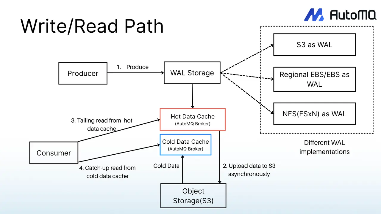 AutoMQ 从架构设计的第一天就考虑了冷热数据隔离问题,将数据路径拆分为三条独立通道: