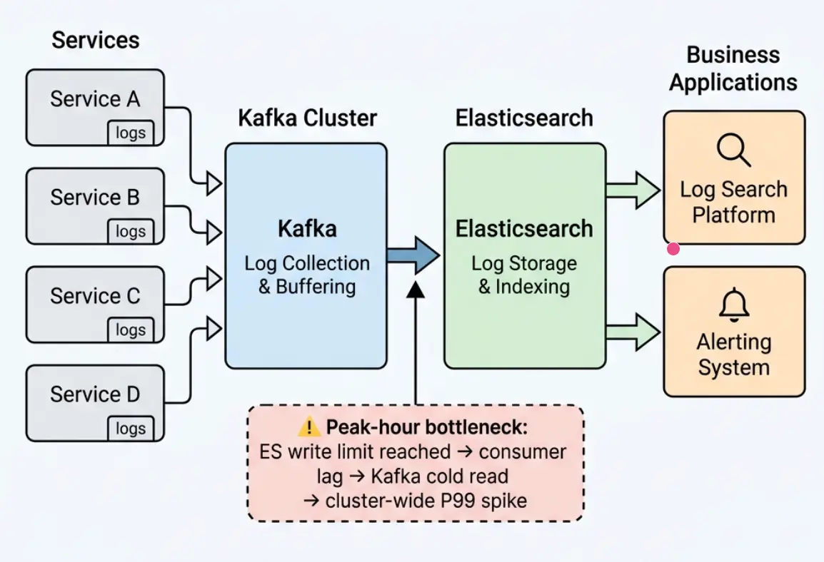 360 云平台对此深有体感。360 有一个核心业务场景:线上服务的统一日志检索平台,所有服务的运行日志通过 Kafka 收集,统一写入 Elasticsearch,业务基于 ES 做日志检索和告警。这个业务的特点是波峰波谷明显------每天业务高峰期,下游 ES 写入达到瓶颈,消费者跟不上生产者,消息开始积压,正是上面描述的冷读场景。实际表现:业务高峰期消息积压达到 10 亿条、约 200 GB,集群写入 P99 飙升到约 10 秒,同集群内其他业务的 topic 也受到影响,日志检索和告警的及时性无法保障。