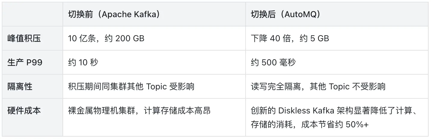 日志检索平台切换到 AutoMQ 后,困扰团队已久的业务高峰期消息积压问题被彻底解决。下表对比了切换前后积压数据处理的核心指标,可以看到 AutoMQ 显著提升了 Kafka 生产消费链路在消息堆积场景下的处理效率。