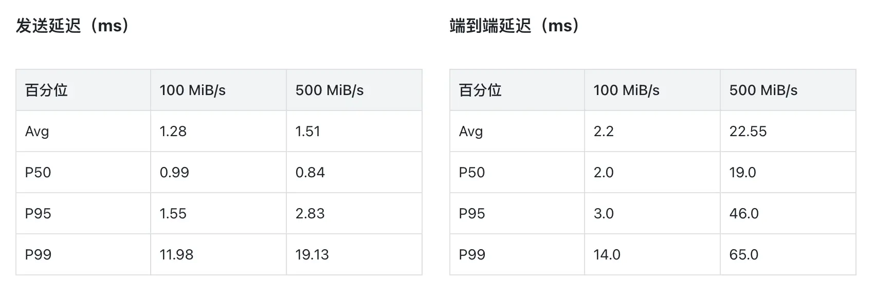 评估环境就绪后,第一步是验证基础延迟是否满足生产要求。团队在 8 节点 Broker 集群上,使用业界标准的 OpenMessaging Benchmark 框架,分别以 100 MiB/s 和 500 MiB/s 两个负载级别进行压测(acks=all,确保数据持久化后再返回成功):