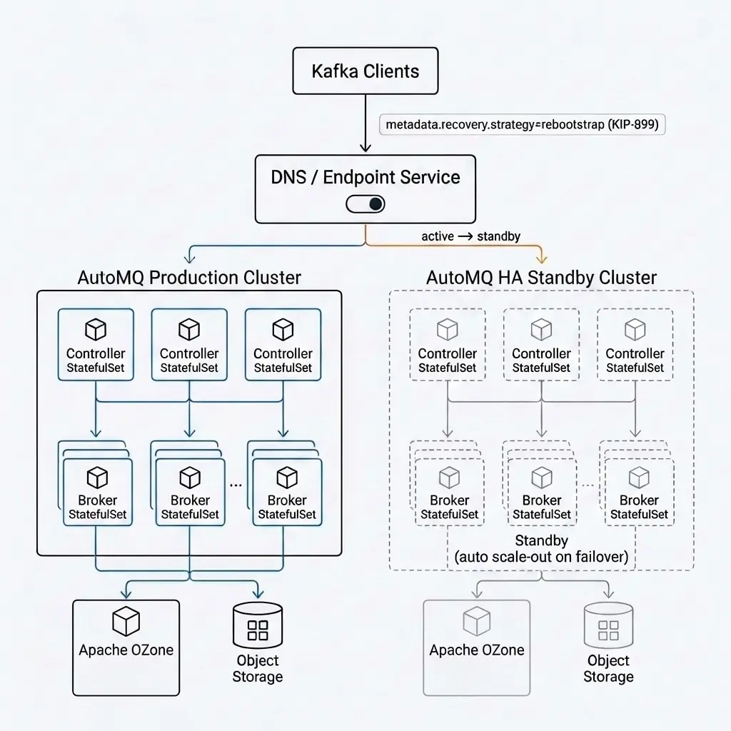360 的做法是:每个 AutoMQ 集群配备一个 HA 备用集群,定时同步集群元数据。生产集群通过实时写检测持续监控健康状态,一旦检测到异常,自动将集群 DNS 解析切换到备用集群,同时修改 Endpoint 服务返回的集群地址。客户端侧配置 metadata.recovery.strategy=rebootstrap(Kafka KIP-899),故障发生后客户端自动重新初始化连接地址完成集群切换,备用集群按需弹性扩容承接流量。这套方案充分利用了 AutoMQ Broker 无状态的特性------备用集群无需预先承载数据,只需在切换时快速扩容即可。