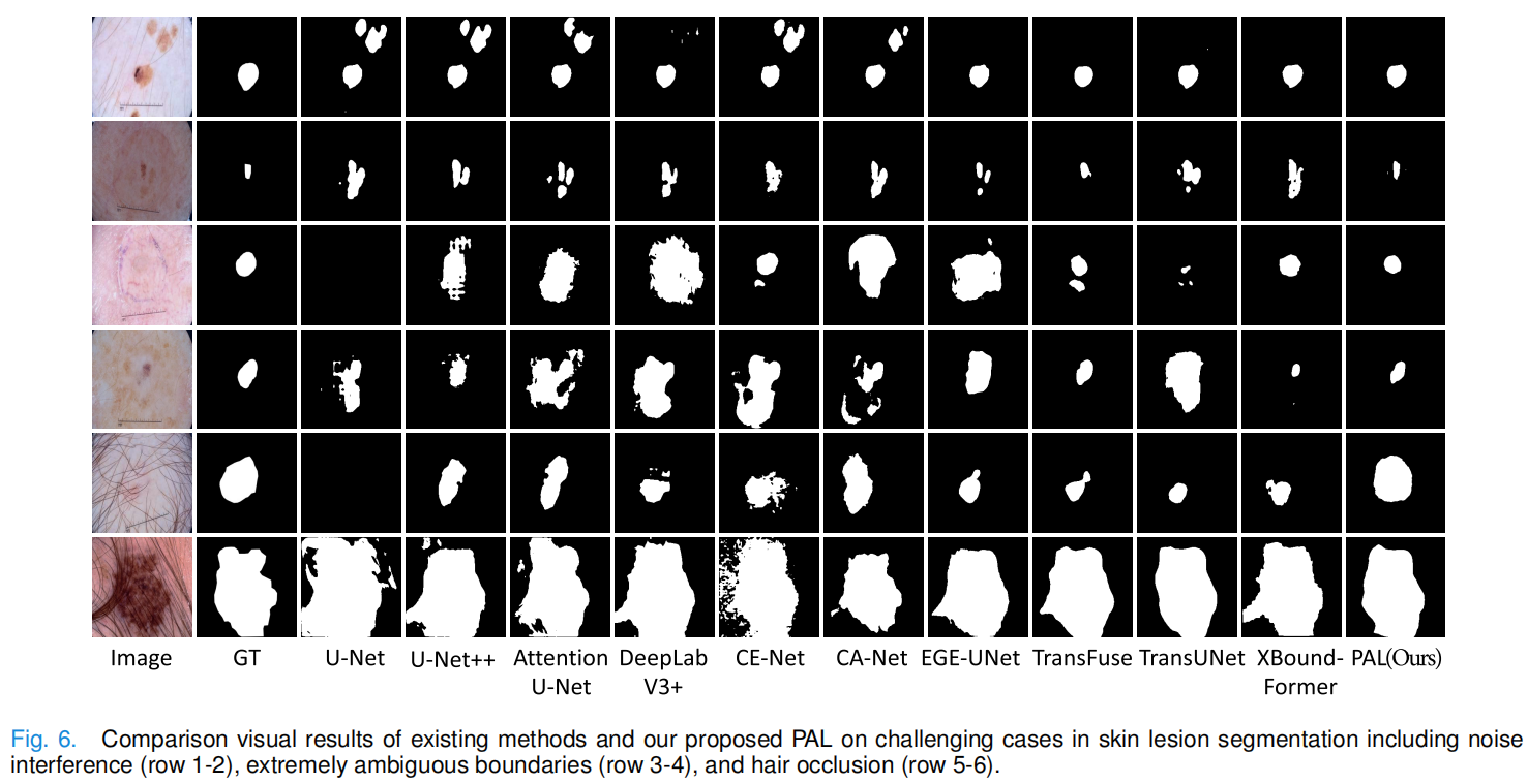 在 ISIC 2017 和 ISIC 2018 两个公认的皮肤病变基准数据集上,作者将 PAL(分别搭载 ResNet50 和 PVTv2 骨干网络)与涵盖了 CNN 系列(如 U-Net, nnUNet)和 Transformer 系列(如 TransUNet, XBound-Former)的最前沿模型进行了全面对比 。