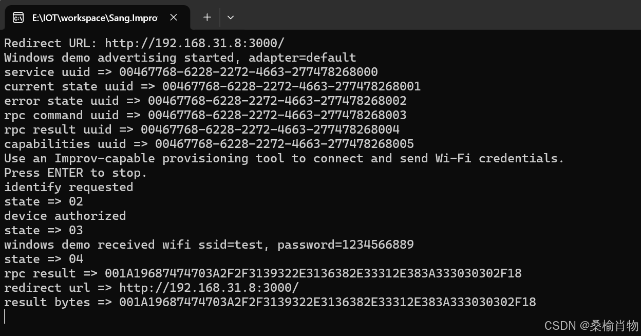 这个示例没有真正去连接系统 Wi-Fi,它只是把协议流程跑通。真实项目里,你通常会在 ProvisioningRequested 事件中接入自己的联网逻辑。