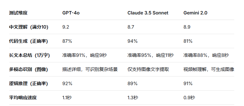 我们发现:GPT-4o综合能力均衡,适合通用场景;Claude 3.5在代码与长文写作上表现突出;Gemini 2.0则在多模态与实时信息处理上有优势。 本文通过六大维度、实测数据与典型场景对比,帮助读者找到最适合自己的AI助手。
