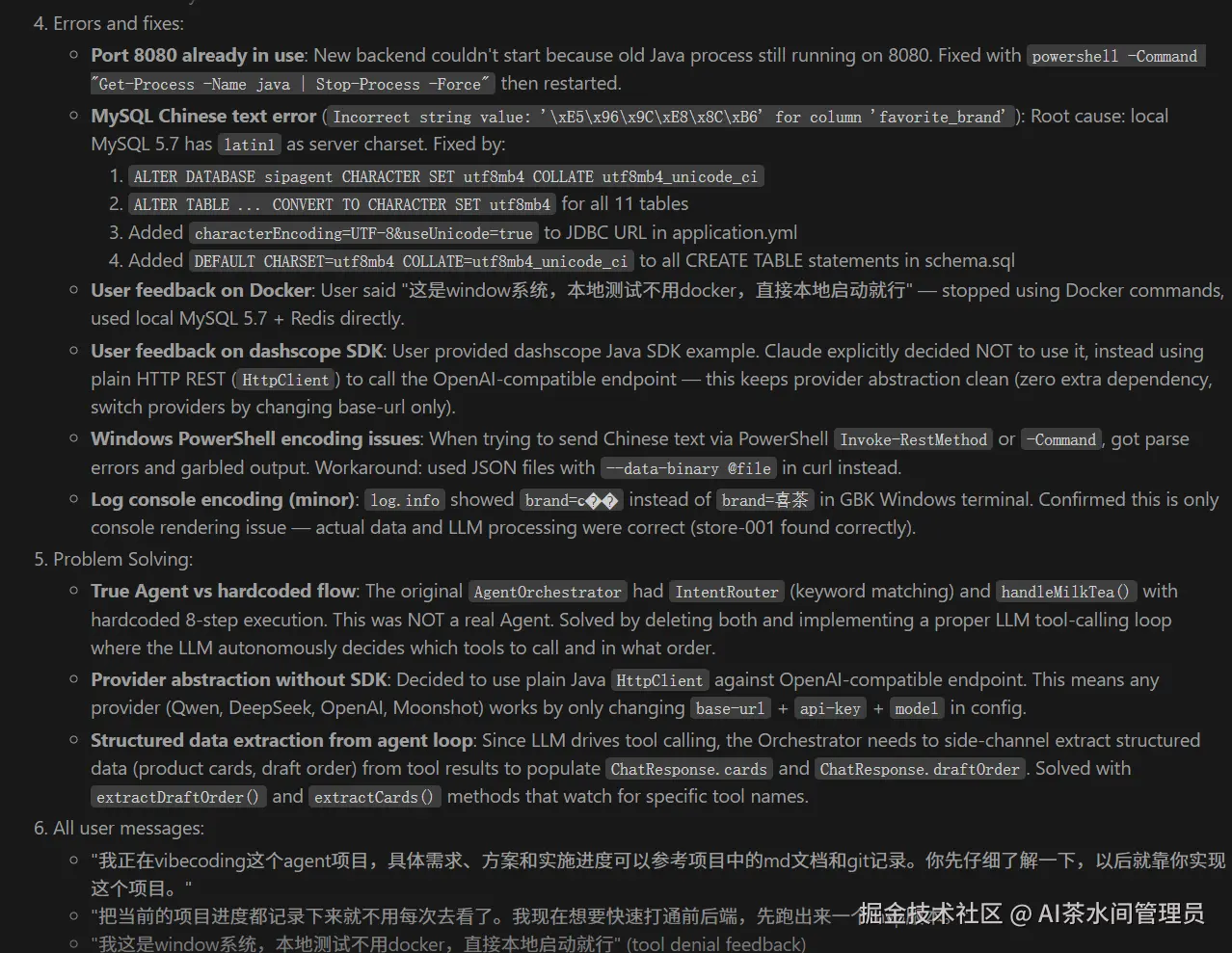 | 6 | All User messages(所有用户消息摘要) | 提炼你的所有核心诉求、开发习惯和隐性要求,不用反复跟 AI 对齐需求 |