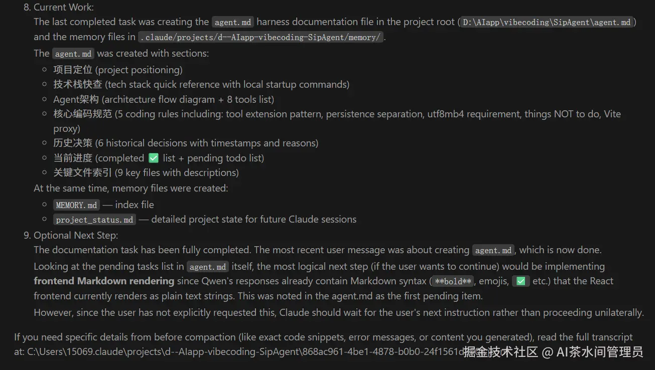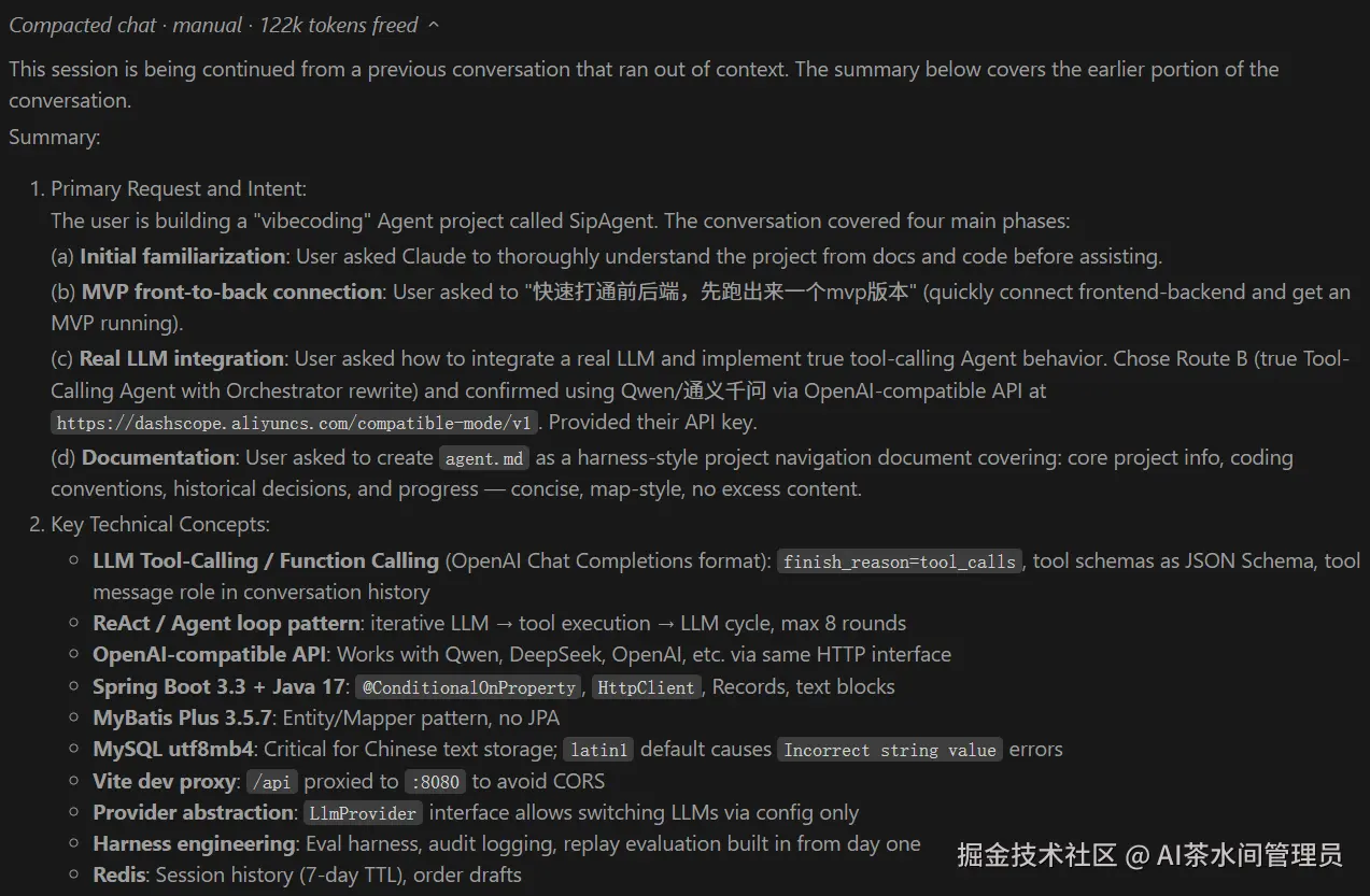 为了回答这个问题,我基于最近在开发Agent项目时的一次真实压缩记录,带大家看看压缩命令留下的"精华"到底长什么样。
