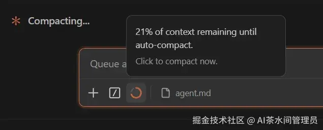 你在界面上看到的Compacting...,就是 Claude 的自动压缩提醒。但比起被动触发的自动压缩,当看到XX% of context remaining until auto-compact时,手动执行 compact 命令的可控性更强,保留的信息也更贴合你的开发节奏。