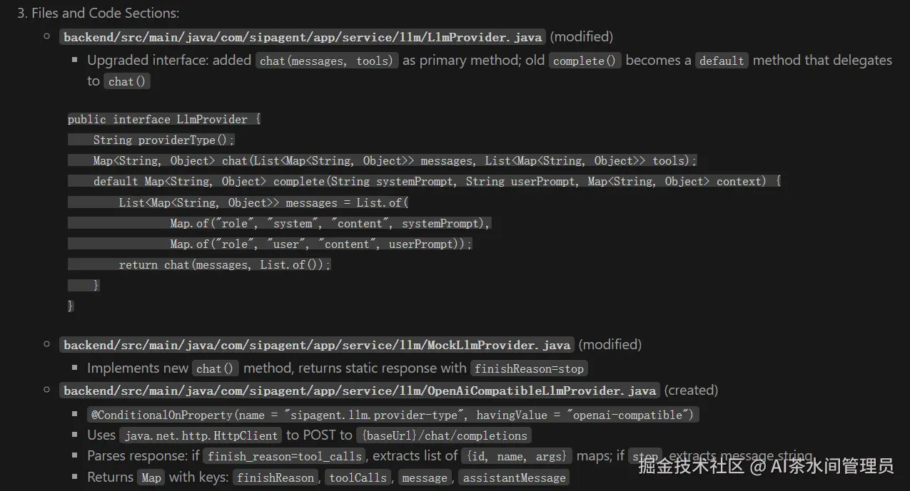 我以正在开发的Agent 项目为例,给大家完整还原手动压缩后的信息结构。这个项目是一个能自主调用工具的 AI Agent,前后端分离,连续开发了 3 小时,对话超过 20 条,手动执行 compact 命令后,Claude 提炼出了 9 个核心模块,构成了完整的项目记忆骨架。