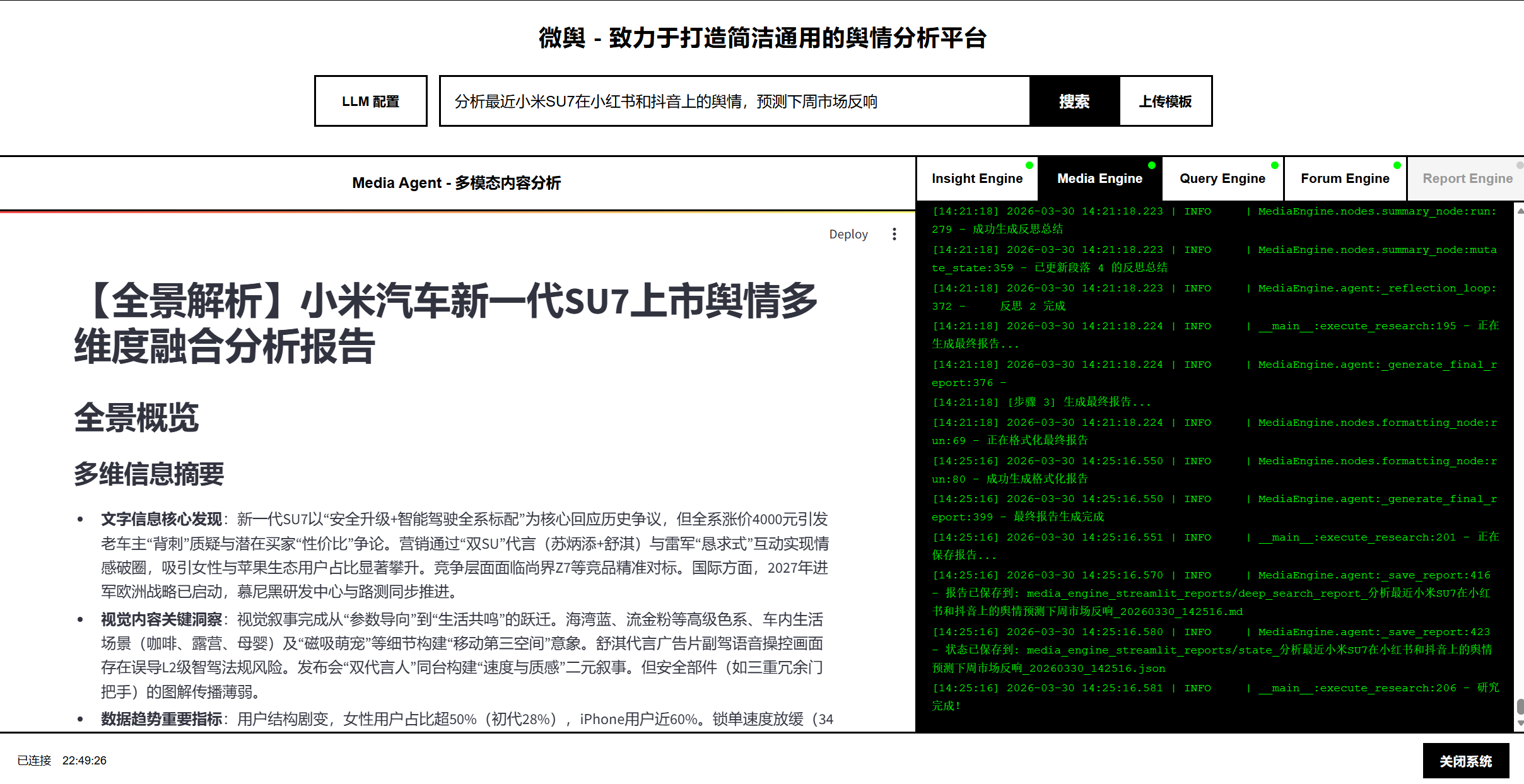 最近在 GitHub 上发现了一个有意思的项目------BettaFish(微舆)。它不只是一个爬虫工具,而是一个从零开始实现的多智能体舆情分析系统。简单来说,过去需要人工花几天时间梳理的舆情信息,现在几分钟内就能自动完成。你只需要像聊天一样输入分析需求,系统会自动爬取微博、小红书、抖音等平台的相关内容,再由多个 AI Agent 分工协作,最终生成一份结构化的 HTML 分析报告。整个流程在本地环境运行,数据完全掌握在自己手里。