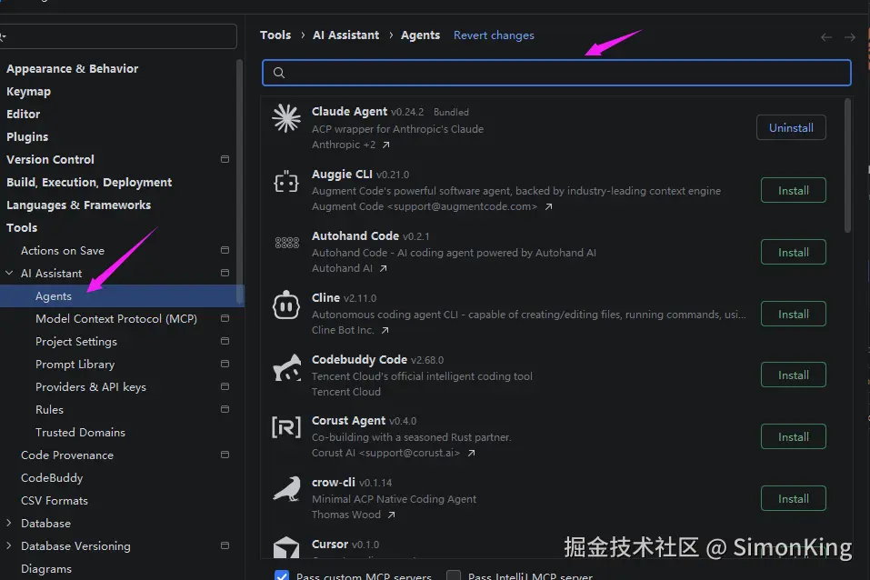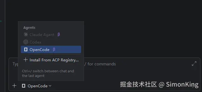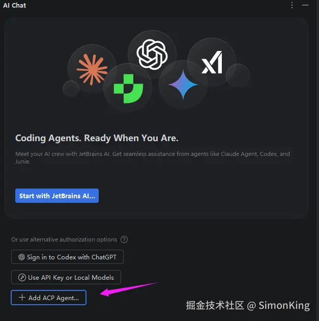 安装完成之后,可以通过Add ACP Agent添加想要的智能体,插件默认自带claude Agent。