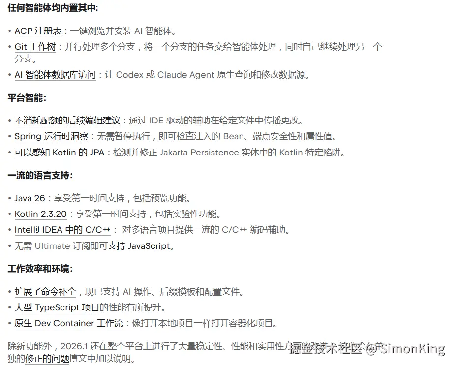 现在终于官方支持了,就在几天前,JetBrains正式发布了IntelliJ IDEA 2026.1。这一次的更新,不是简单的版本号递增,而是一次开发范式的智能跃迁------IDE正在从一个被动的"代码编辑器",进化为一个开放的"AI智能体平台"。