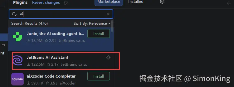 直接在插件市场搜索官方插件:JetBrains AI Assistant或者直接搜索AI即可