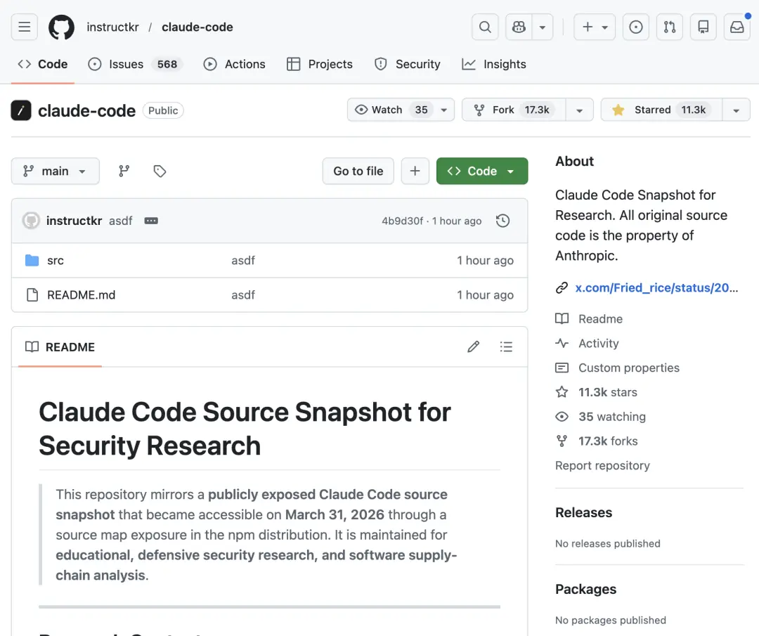 更扎心的是,泄露规模不是"漏了几个脚本"这种小事故,而是 1900 个 TypeScript 源文件、51.2 万行代码、一个 59.8MB 的 source map 文件 ,外加一堆没正式公开的功能线索。一个小时内,GitHub 上最大的备份仓库就冲到了 11,300 star、17,300 fork、568 个 issue。fork 比 star 还多,说明大家的共识非常统一:先存一份再说。
