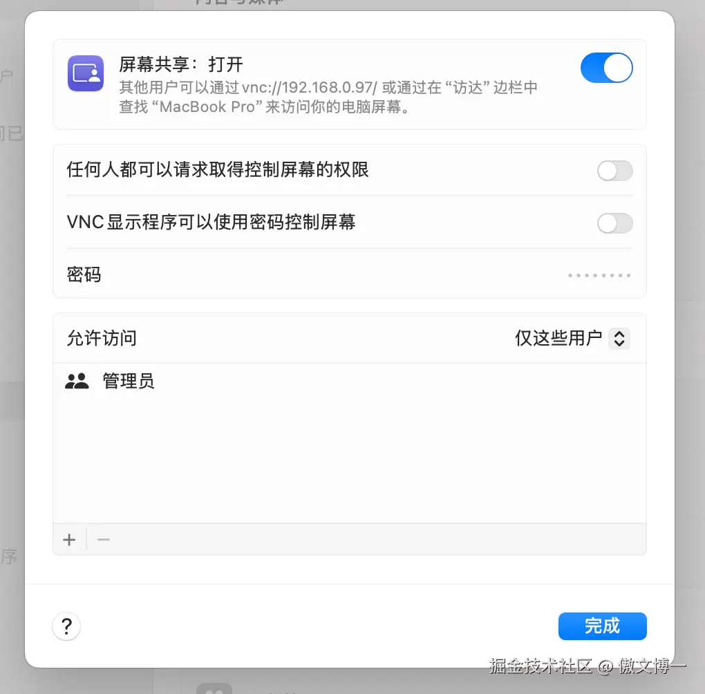如果你的真实需求是:我想看到另一台 Mac 的桌面,并且直接操作它 ,那更简单的办法其实是走 VNC,也就是 macOS 自带的屏幕共享能力。