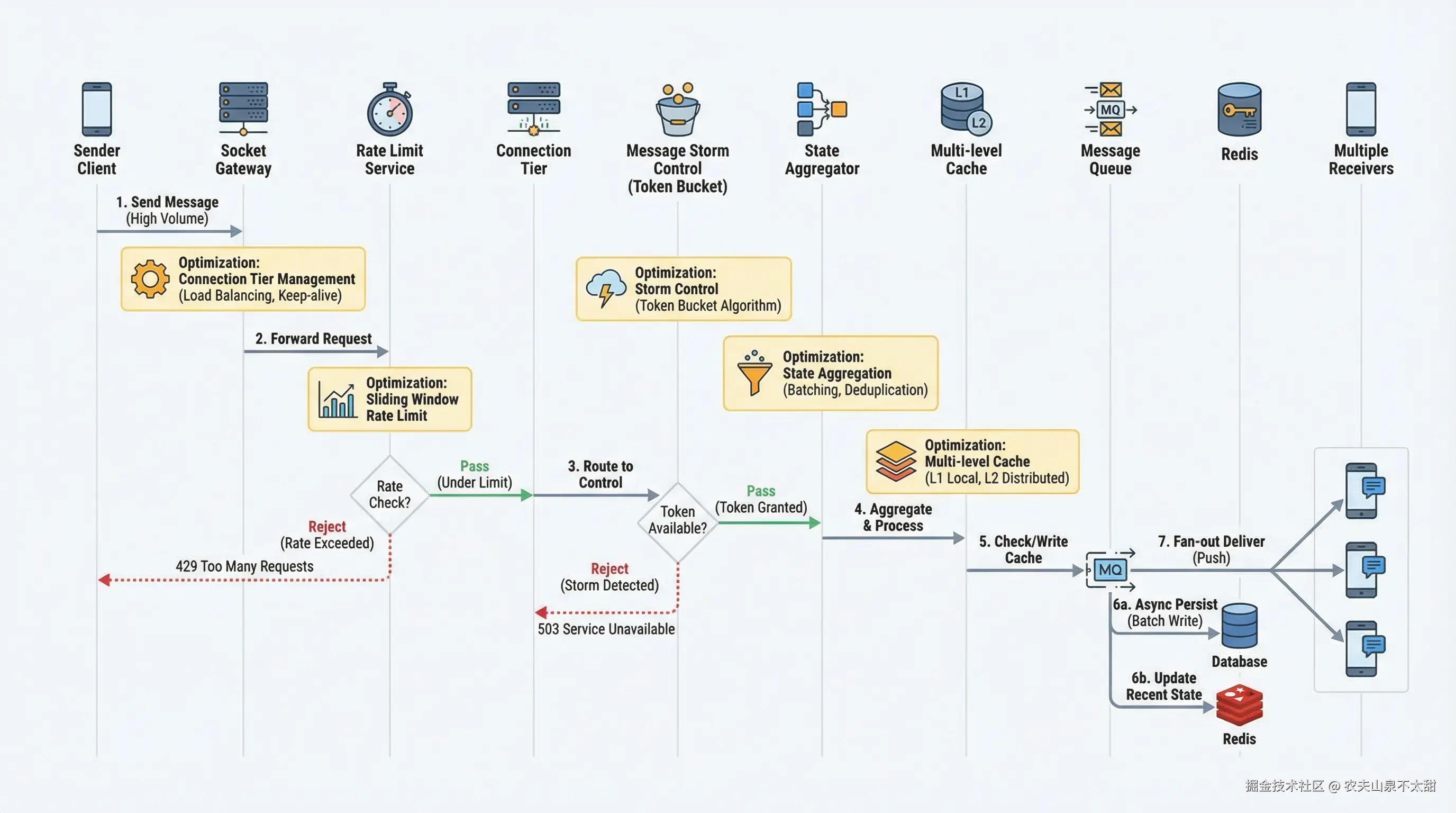 在 IM 通信文档协同场景下,通过连接分级管理实现资源的差异化分配,通过消息风暴控制器防止系统在高峰期过载,通过状态聚合服务减少无效的网络传输,通过多级缓存保护数据库,这些优化策略在 NestJS 框架下得以用更加声明式和可维护的方式实现。整体架构既保持了高性能,又提供了良好的可扩展性和可测试性,适合作为企业级 IM 服务的基础框架。