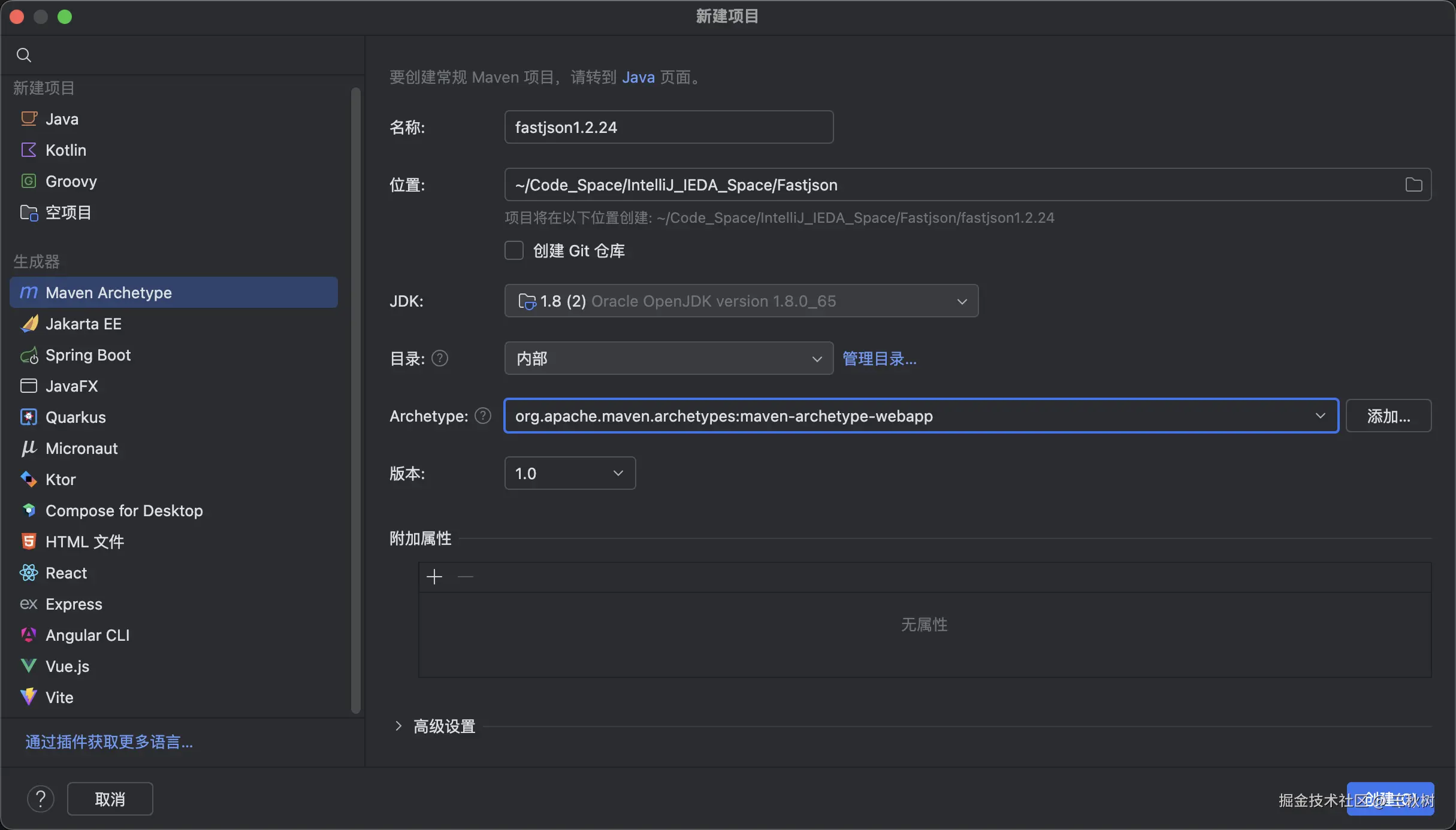 先新建一个 maven 项目, 为了方便测试,我们设置 jdk 为 1.8.0_65