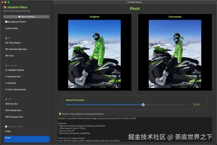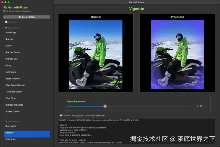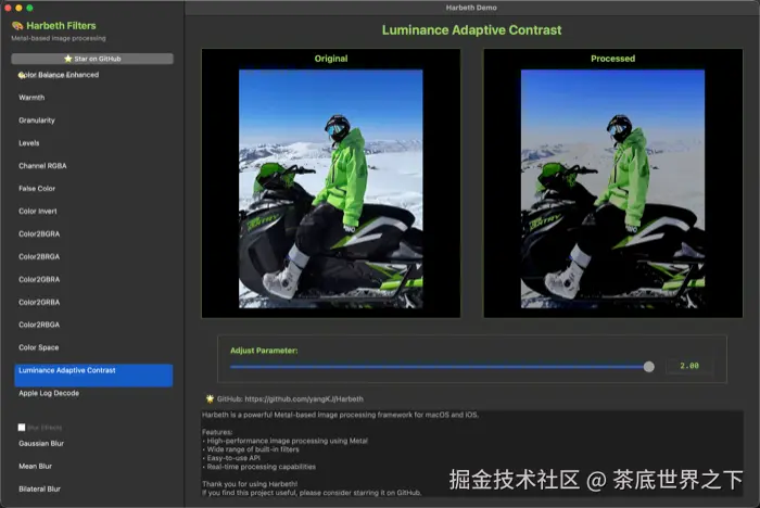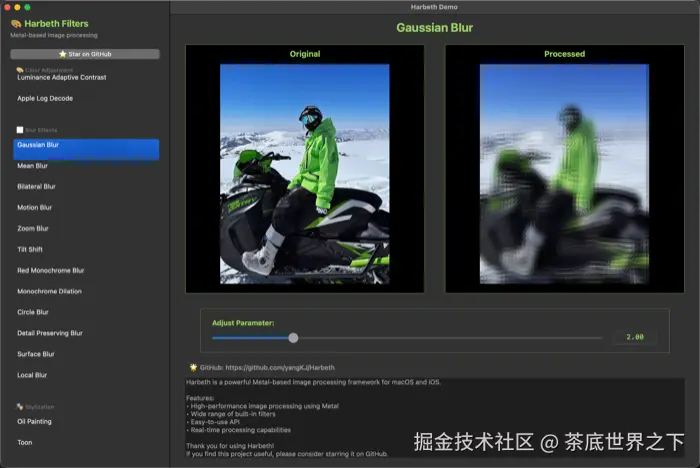 Harbeth是一个基于Metal的高性能图像处理库,为iOS和macOS开发者提供了一套简洁、高效的图像滤镜解决方案。它不仅支持传统的图像滤镜效果,还能处理HDR图像,让你的应用在图像处理方面如虎添翼。