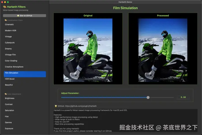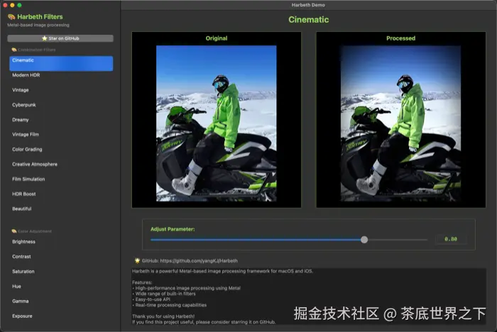 Harbeth是一个功能强大、性能优异的Metal图像处理库,它不仅提供了丰富的滤镜效果,还支持HDR图像处理,为iOS和macOS开发者提供了一套完整的图像处理解决方案。