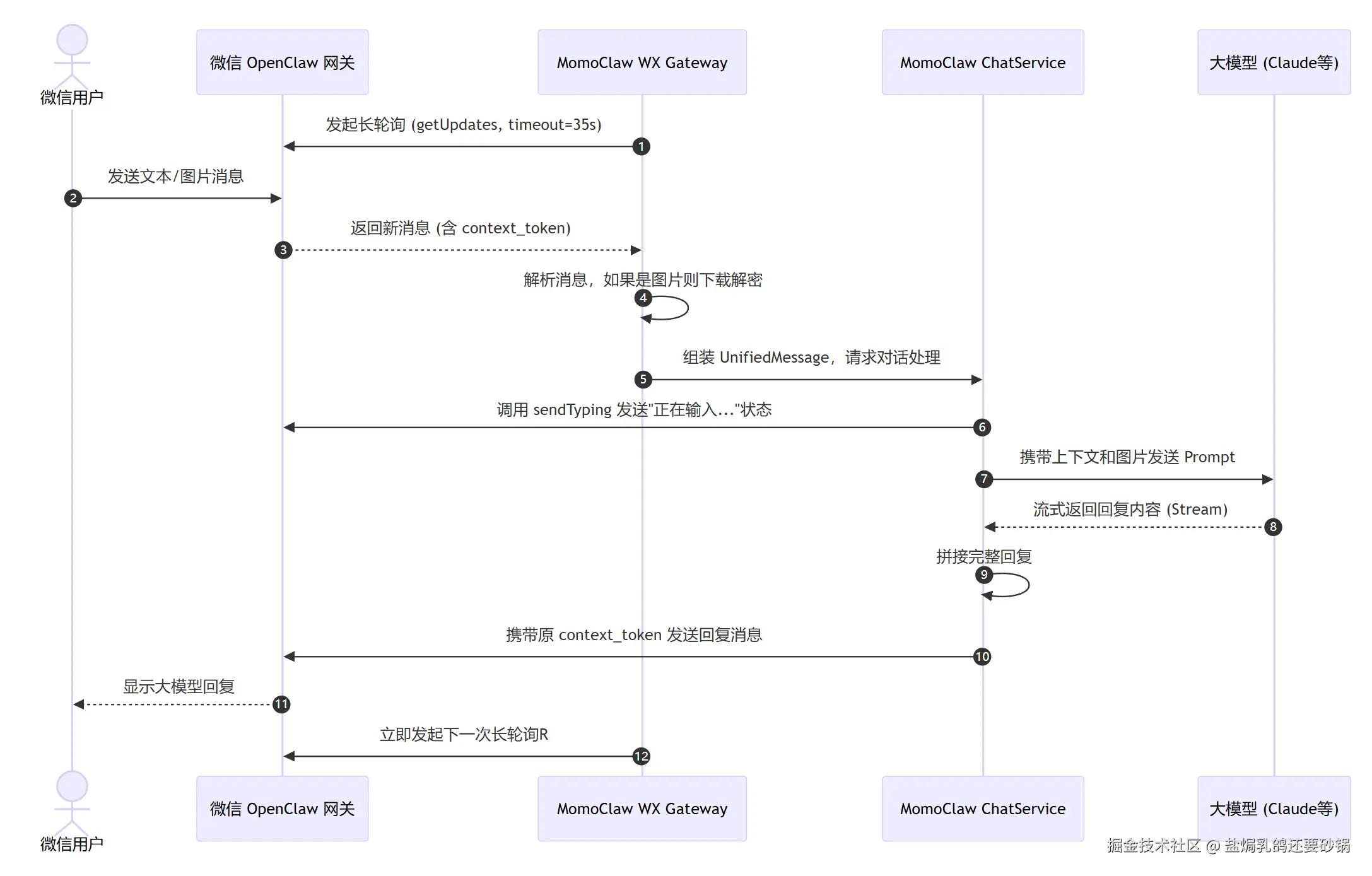 - Gateway 层(门卫大爷) :负责"长轮询",死死盯着微信服务器,一有新消息就抓过来。