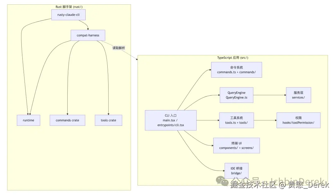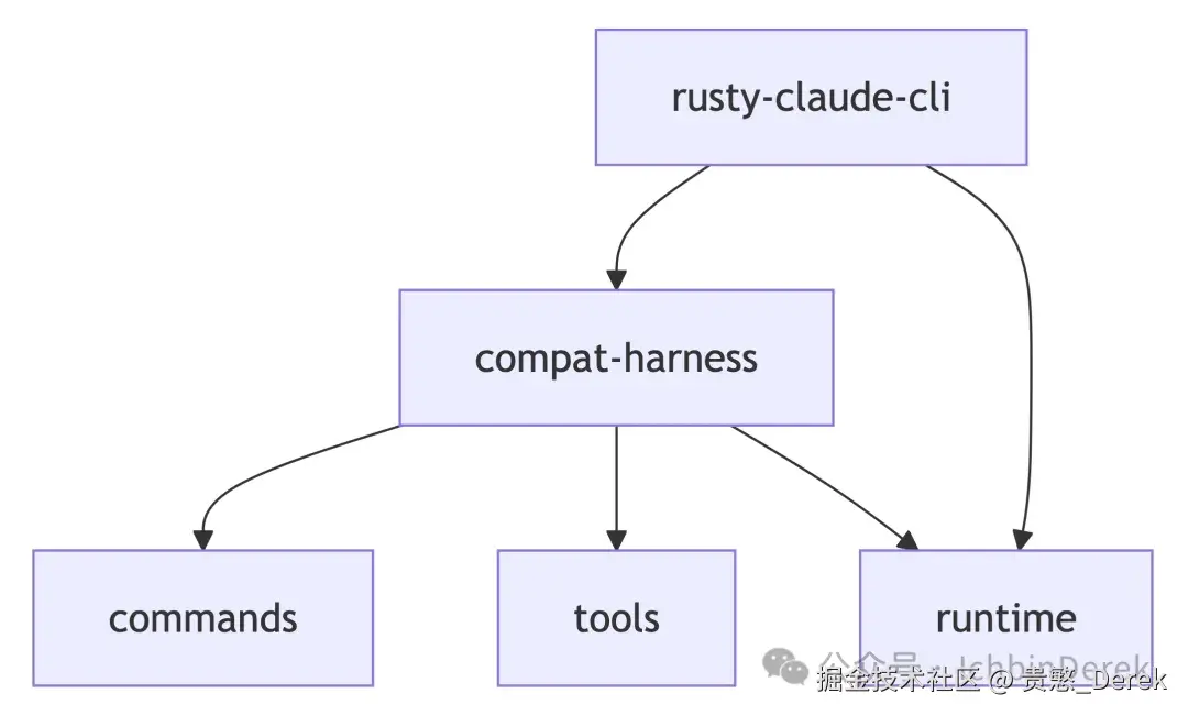 - Rust 子工程 是 对齐上游接缝的脚手架 :用独立 crate 划清 runtime / commands / tools ,由 compat-harness 从 TS 源码抽取清单与启动阶段事实,rusty-claude-cli 暴露开发期命令。