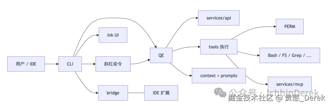 - 输入:用户在 TUI 输入或 IDE 经 bridge 注入消息。