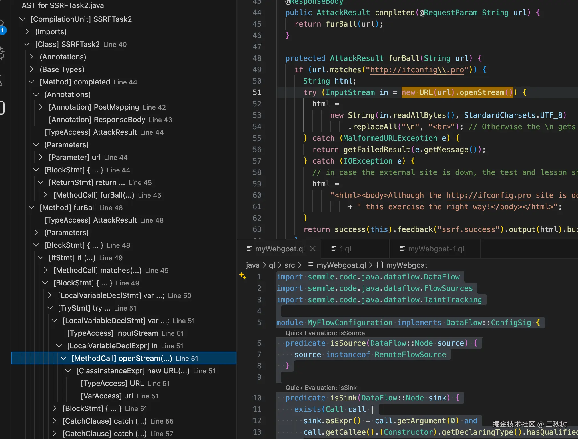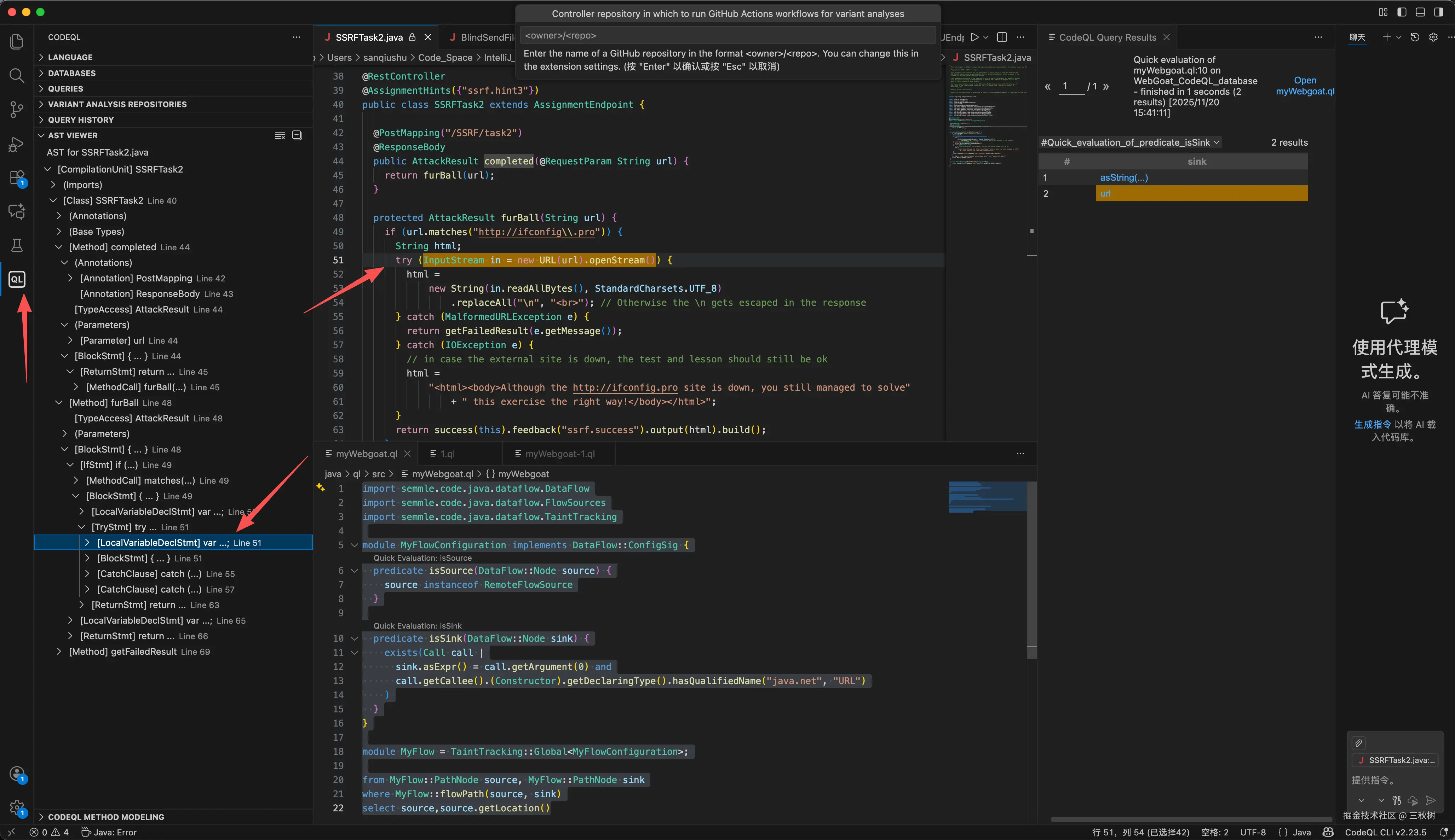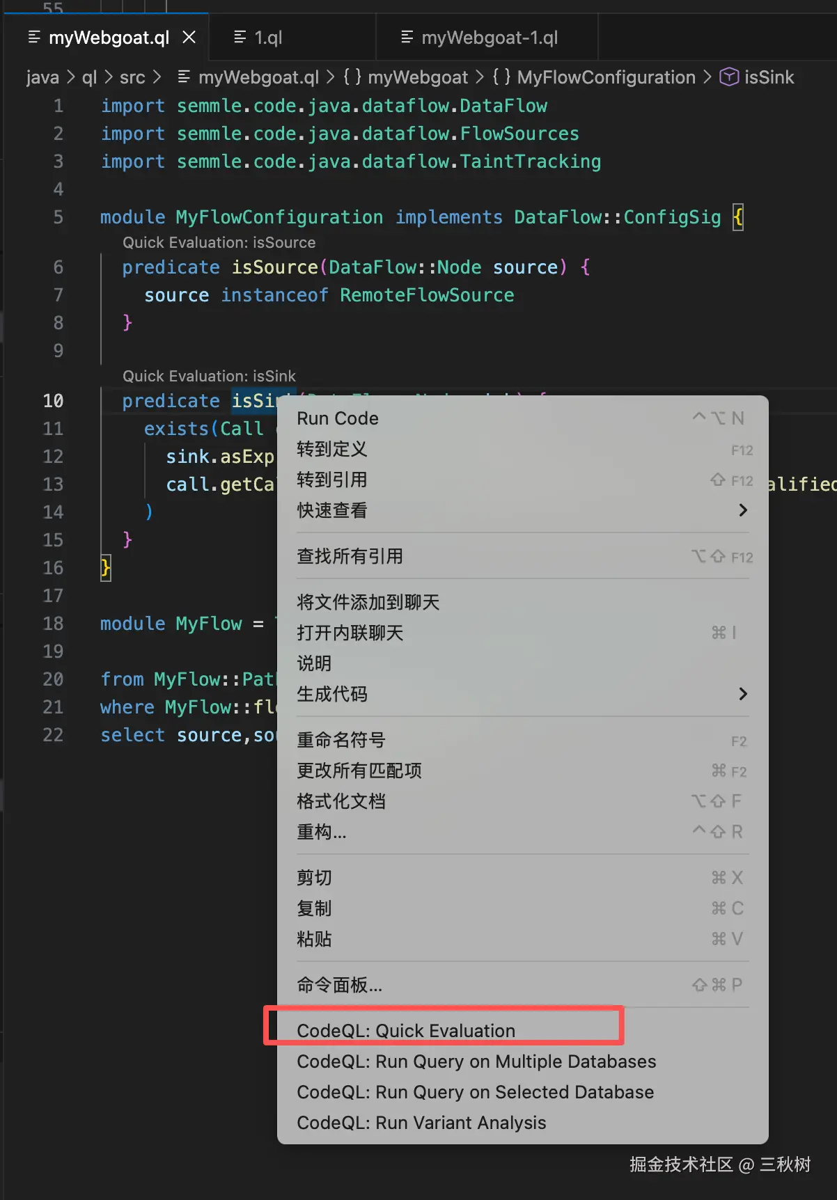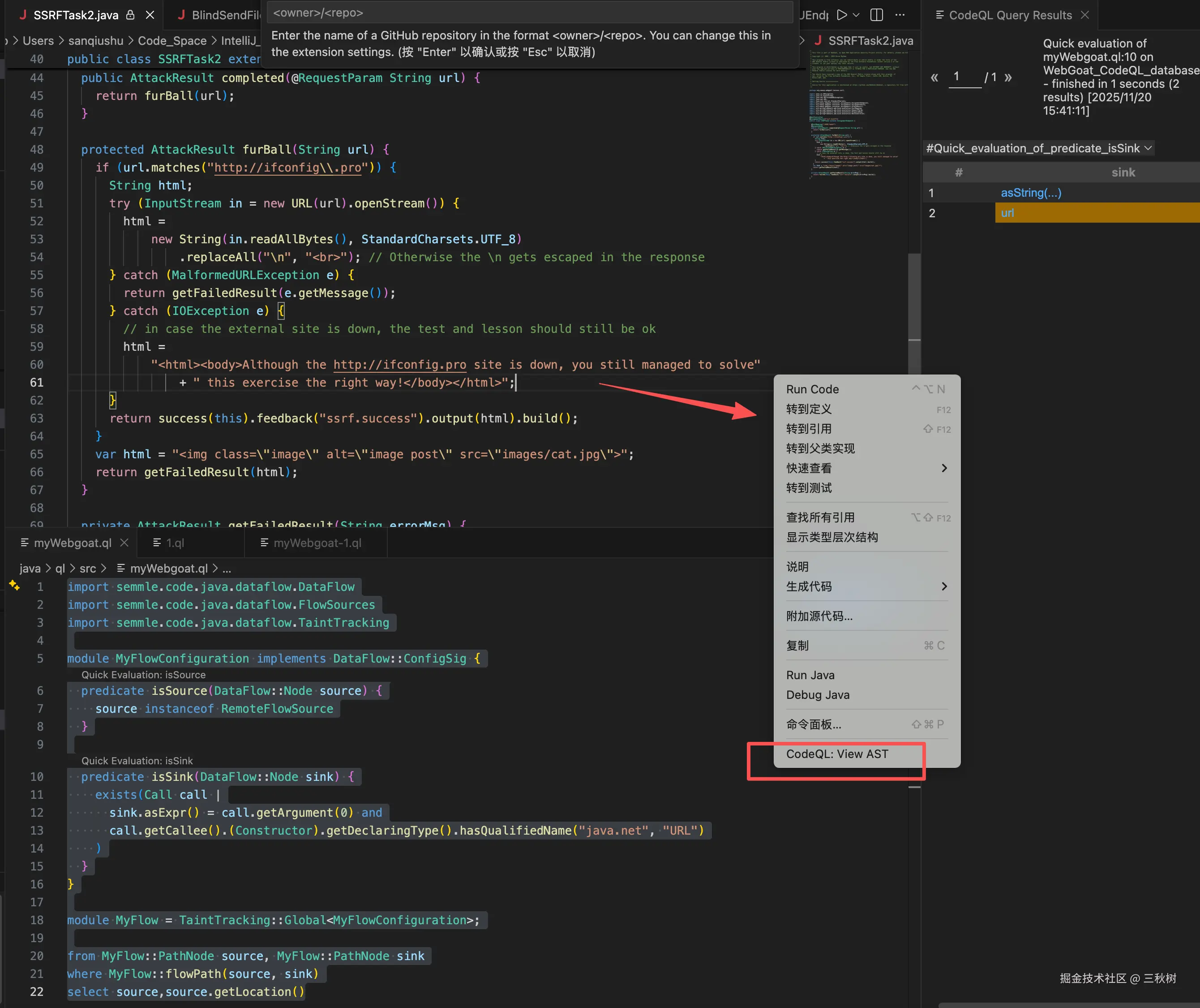 我在刚才在 isSink() 上执行了快速评估,发现 isSink() 确实找到我想要的代码,然后就可以在 java 代码那里鼠标右键选择 CodeQL: View AST