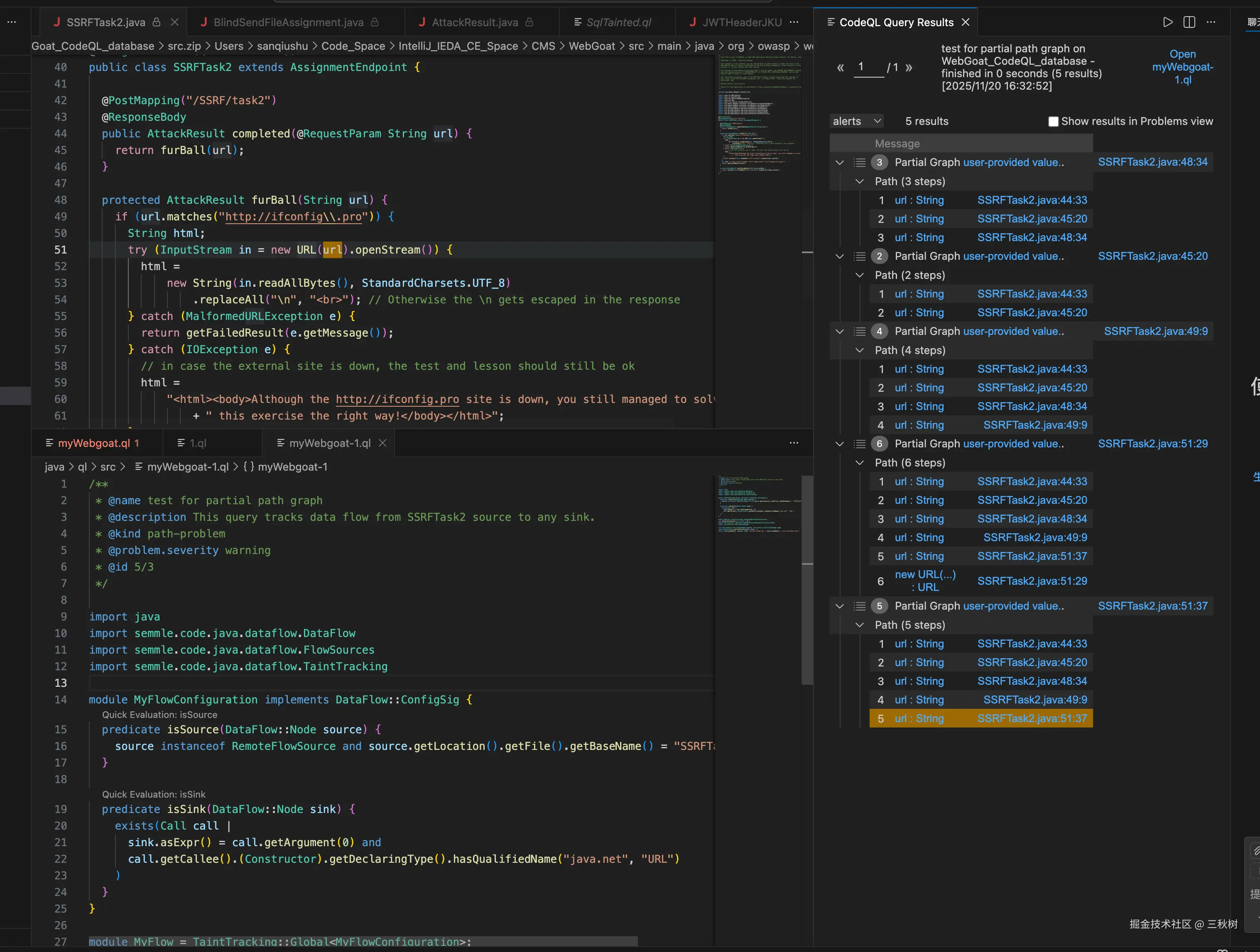 我这里查到了 5 条路径,哪些 3 步、2 步就结束的路径应该是指向其他 sink 的,但是中途就断了。希望 CodeQL 早日出图形化的展示图吧......