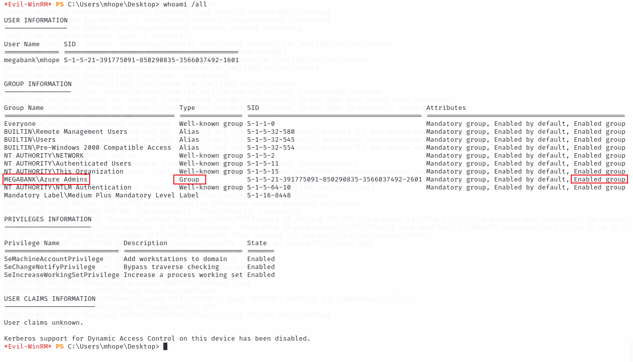 所以 mhope 属于 MEGABANK 域内 Azure Admins 组的成员。其他组基本都是域默认组,所以 Azure Admins 就是答案。