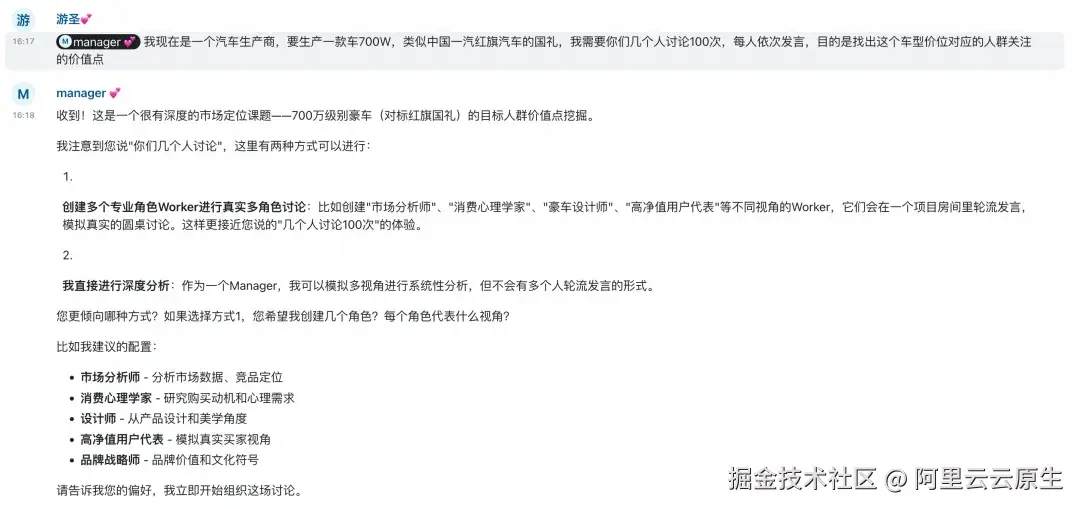 我们来看一个基于 HiClaw 构建的群体智能的实践案例。一家汽车生产商,计划生产一款 700w 的豪车,通过设计 N 个角色,由他们进行 100 次的讨论,给出一个结果。