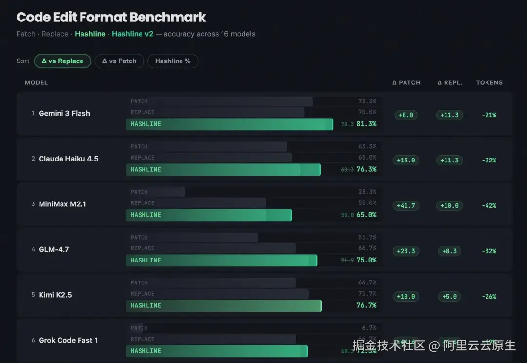 他设计了一种叫 Hashline 的新方案:当模型读取文件时,每一行都附带一个 2-3 字符的内容哈希标签。模型编辑时只需引用这些标签,而非复现原始文本。