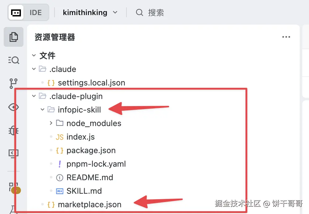看如图结构:首先在项目根目录新建一个.claude-plugin文件夹,里面放我们新建好的 skill(前面让 Kimi学习新建好的,也可以直接让它放到这里)和一个marketplace.json文件