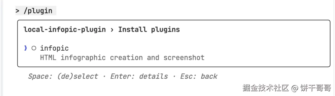此时 /plugin 第一个选项就能看到我们预设好的infopic skill,点进去安装即可。