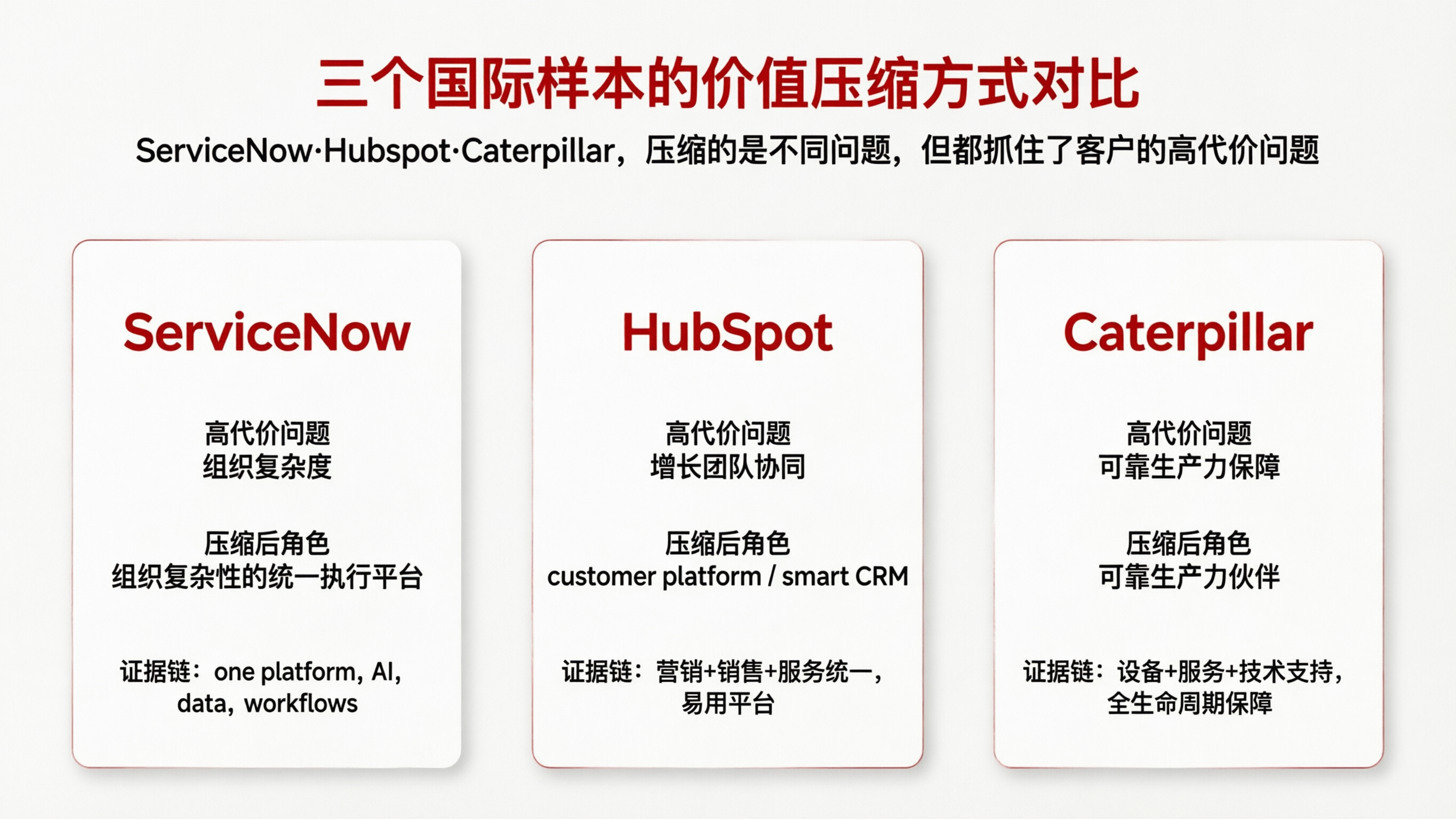 ServiceNow压缩的是组织复杂度问题,HubSpot压缩的是增长团队协同问题,Caterpillar压缩的是可靠生产力问题。