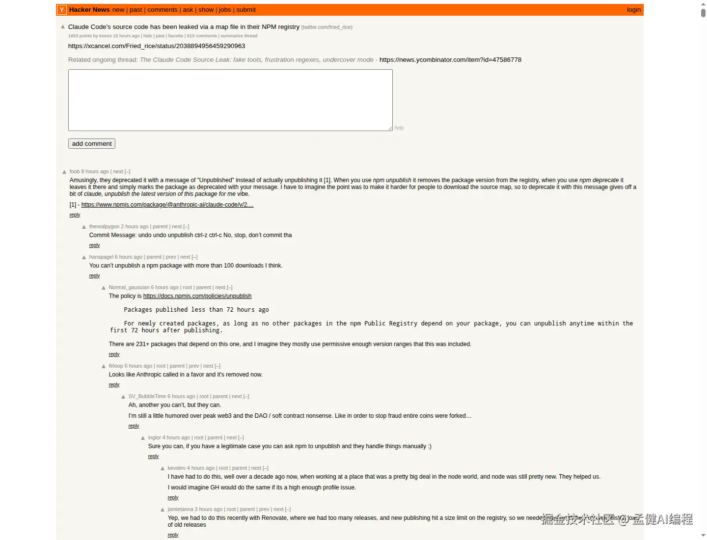 3 月 31 日,Claude Code 因为 npm 包里带出了 source map,完整 CLI 源码被外界读到了。相关讨论在 Hacker News 直接冲到了 1800+ points、900+ comments,说明这已经不是小圈子八卦,而是开发者群体级别的关注。