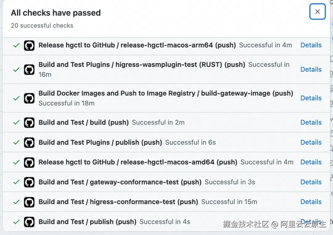 此外,每次新版本发布,不依赖人,而是由程序自动完成也很重要。Higress 社区在每次版本 release 发布后,会通过 GitHub Action 自动制作容器镜像以及安装包,镜像仓库密钥基于 GitHub Secret 存储。发布版本的权限可以给到社区里其他合作者,但无需提供给合作者镜像仓库的密码。