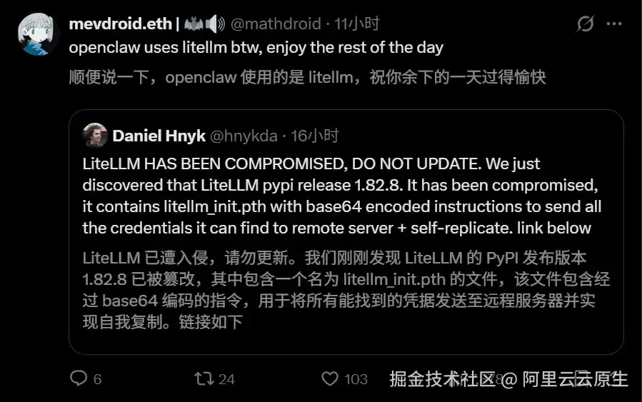 北京时间 3 月 24 日 19 点,PyPI 仓库出现了 LiteLLM 1.82.7 版本。13 分钟后,1.82.8 紧随其后。这两个版本没有经过 GitHub 的 PR 流程,官方仓库中找不到对应的 commit。被第三方安全情报中心监测到这两个版本中混淆了恶意代码。