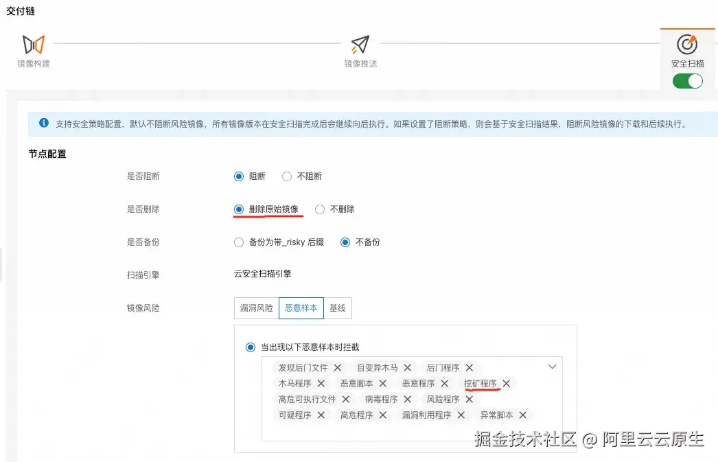 基于阿里云容器镜像服务的云原生交付链功能,可以在镜像推送之后,立即进行恶意脚本扫描,如若发现风险可以立即删除镜像。