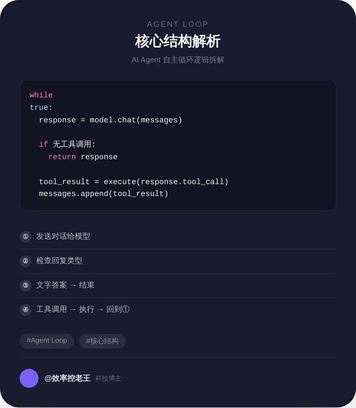 先说结论。Agent 的最小结构可以用几行伪代码表达: