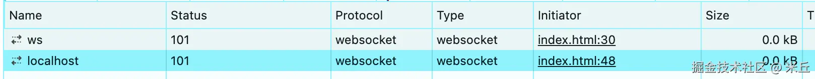 当浏览器通过 WebSocket 与服务端通信时,Network 面板中不会为每一条消息单独显示新的请求 。WebSocket 连接一旦建立(握手请求会显示在 Network 的 WS 标签中),后续的消息传输都以帧(frame) 的形式在同一个持久连接上进行,不会产生新的 HTTP 请求记录。