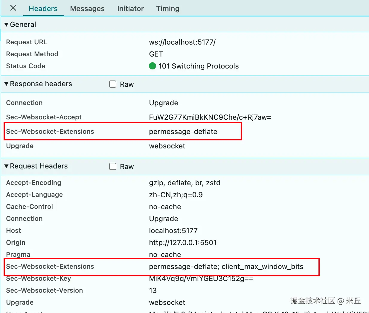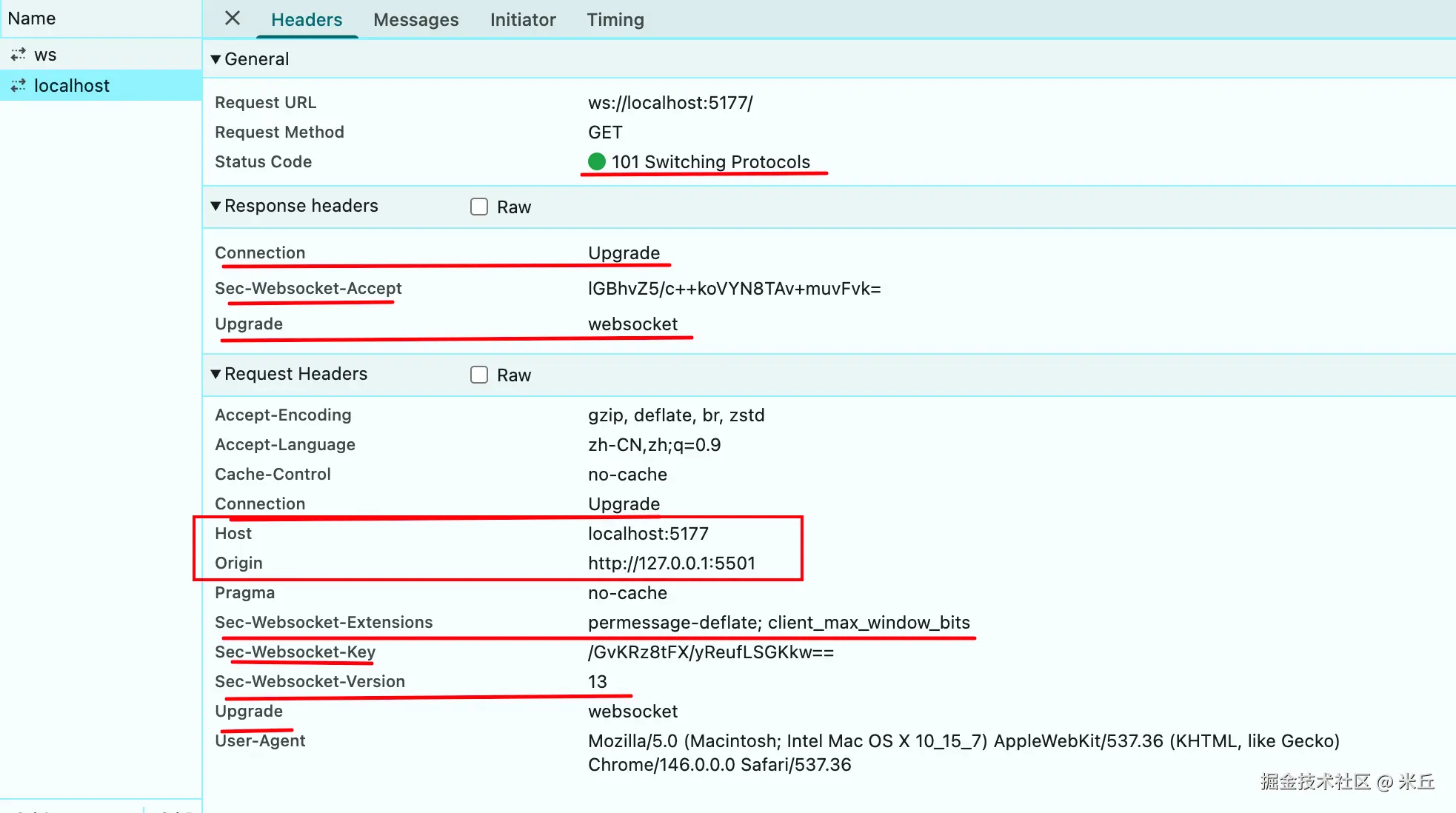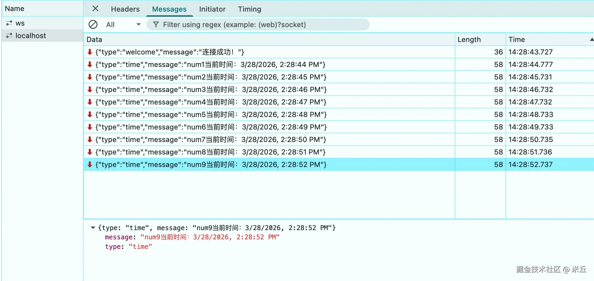 因此,接收服务端消息时,Network 中不会新增 ws 请求,但会在已建立连接的 Messages 面板中显示消息内容。这是 WebSocket 协议的特性:它是一个长连接,而非每个消息独立请求。